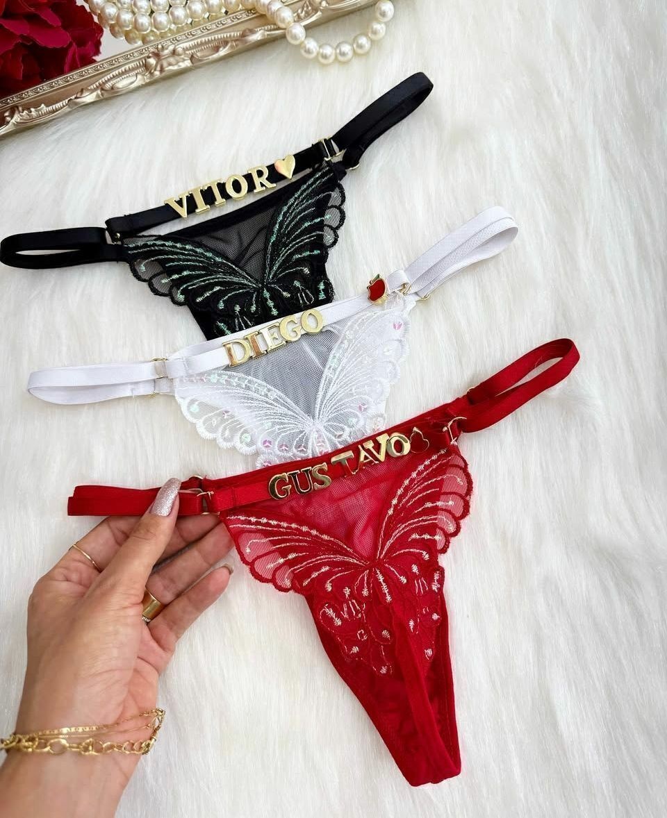 Fio Personalizado extra fino com detalhe bordado e aplicação de lantejoulas; parte da frente em RENDA. Compre e personalize com a palavra que quiser usando os nossos passador de letras ouro 10mm. Ou use sem personalizar como desejar.