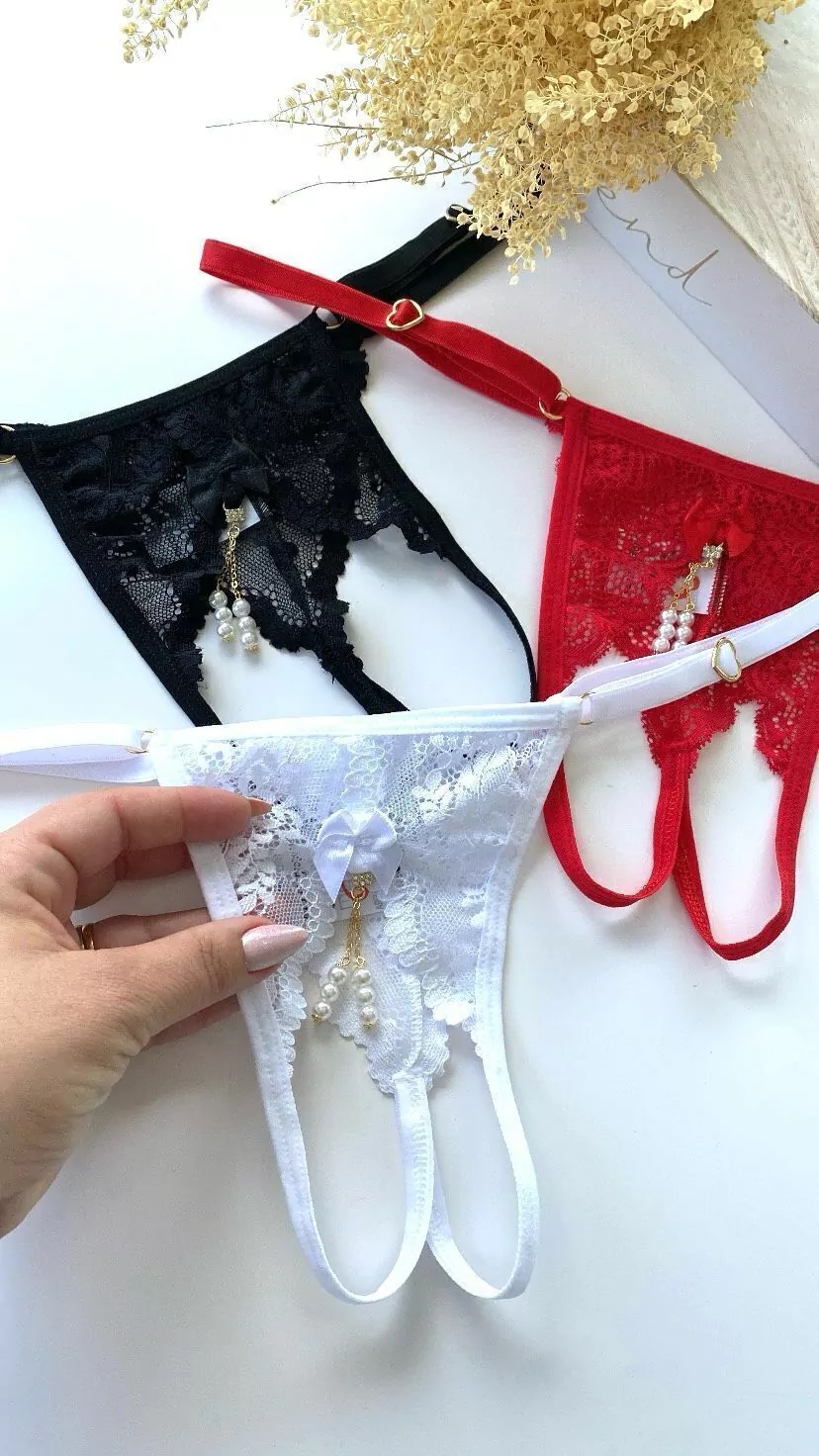 Esta peça ousada é inteiramente confeccionada em renda. Com detalhes de pingente na frente, adicionando um toque sofisticado, a calcinha apresenta um design fio dental, proporcionando sensualidade. A abertura na frente eleva a provocação