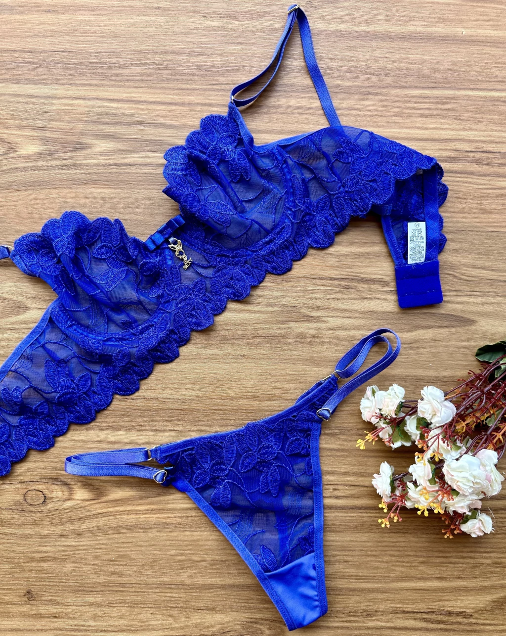 O Sutiã com aro e sem bojo feito no tule bordado; alças com regulagem em metal em modelo de pétalas. A calcinha modelo extra fio toda no tule com alça atrás para personalizar com os nossos passantes em metal cor ouro, possui forro 100% Algodão na parte baixa.