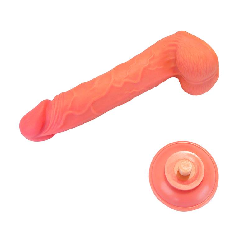 Prótese realística em formato de pênis dupla camada, confeccionado em TPE possui glande definida, textura de veias, escroto e ventosa removível para penetrações em ângulo reto.