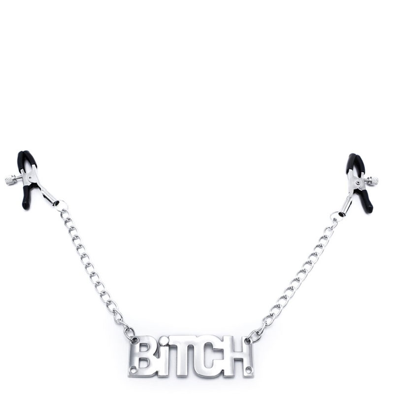 Par de grampos para mamilos com regulagem, possui corrente que interliga os dois grampos com pingente escrito BITCH.