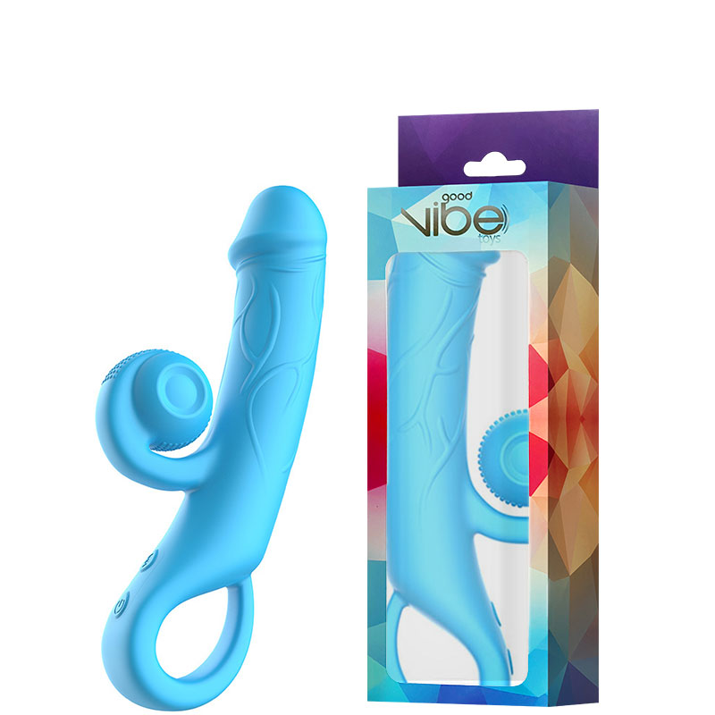 Vibrador recarregável com detalhe de glande e estimulador clitoriano vibratório.