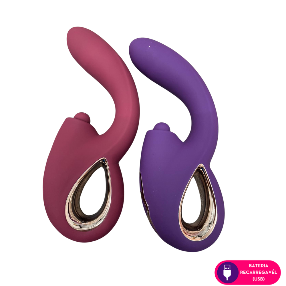 Estimulador 3 em 1, sendo: Um estimulador clitoriano por vai e vem, um estimulador por vibração na ponta e um estimulador por pulsação embaixo. Possui toque suave, aveludado e detalhes metalizados.